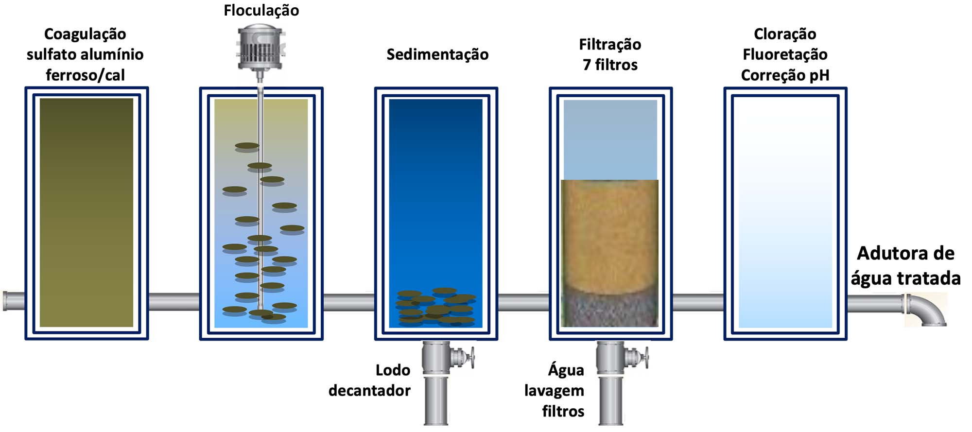 Os processos e operações envolvidos no tratamento de água são: Coagulação, floculação, sedimentação, filtração, cloração, correção de pH e fluoretação.
